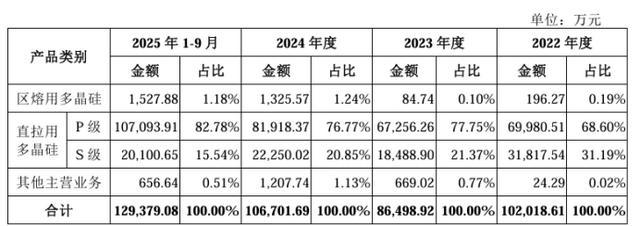其中,p级直拉用多晶硅成为绝对营收支柱,该产品收入分别为7亿元、6.73亿元、8.19亿元、10.71亿元,占主营业务收入的比例从2022年68.6%一路攀升至2025年前九月82.78%。