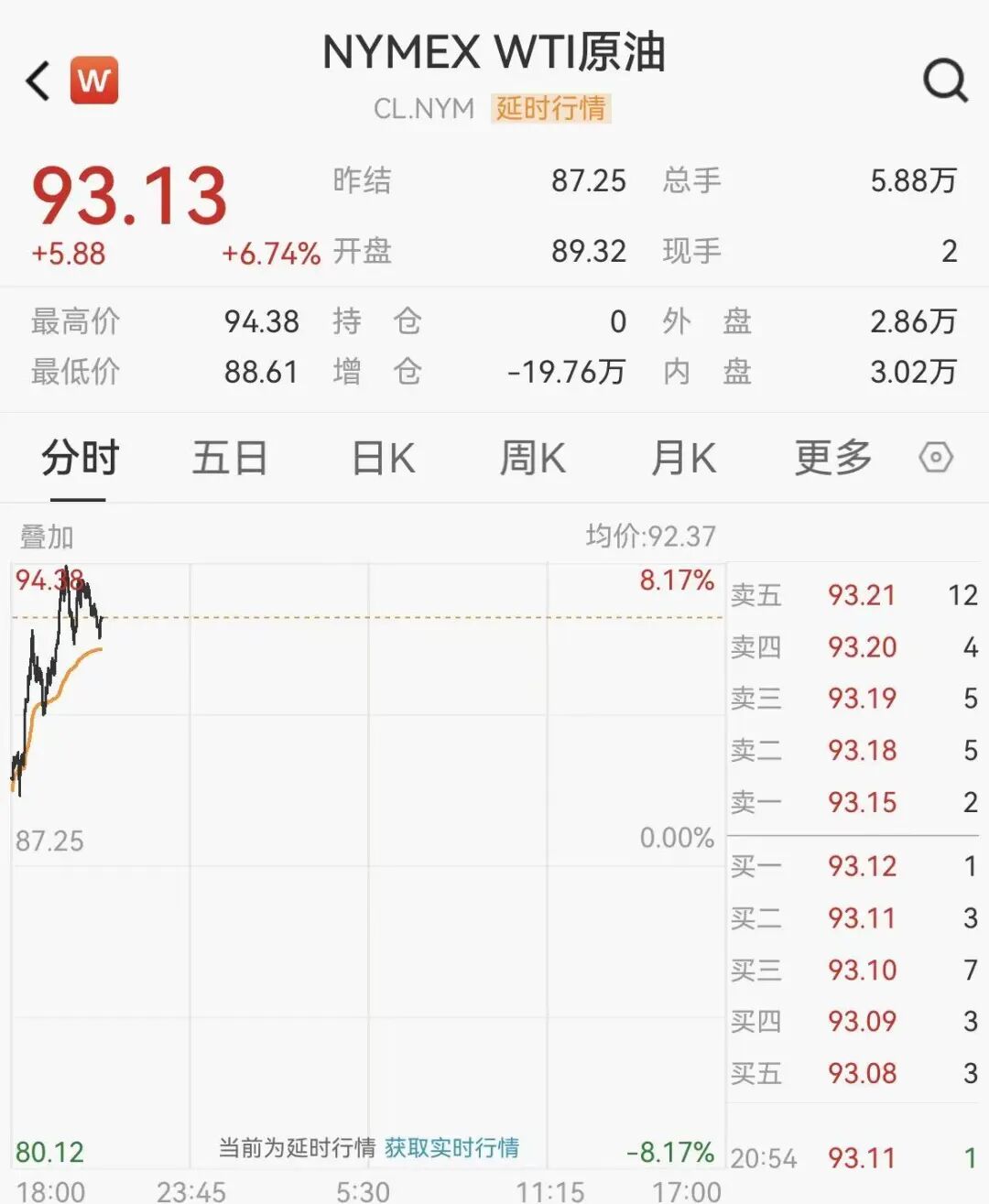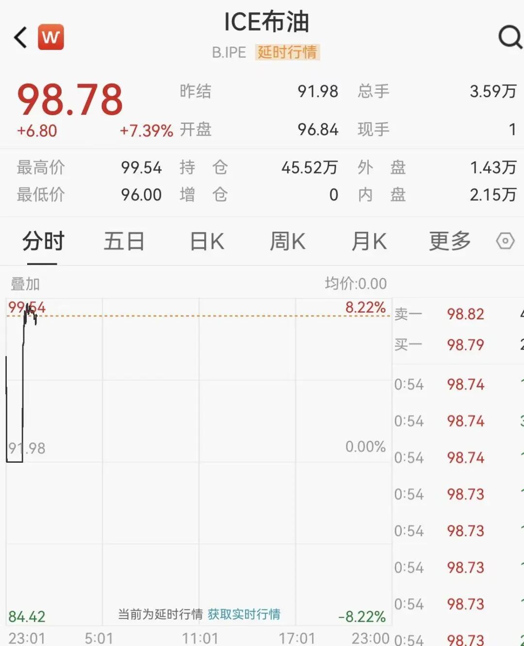 3月12日,国际油价高开高走,美油、布油双双一度涨超8%,布油向上触及99美元/桶。